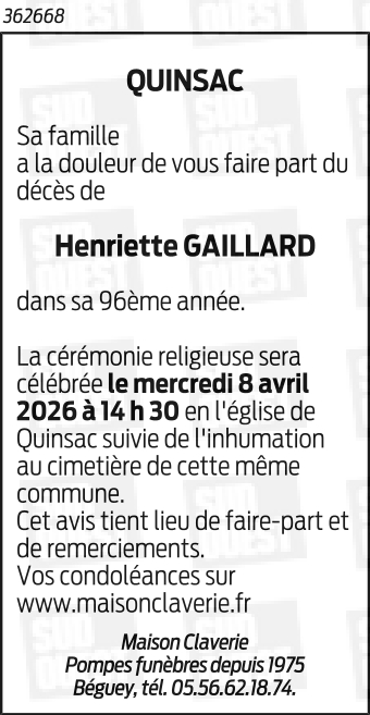 Déroulement des funérailles de Madame Henriette GAILLARD