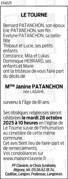 Déroulement des funérailles de Madame Janine PATANCHON