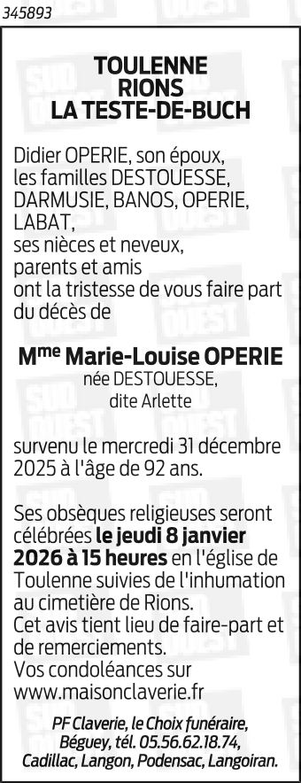 Déroulement des funérailles de Madame Marie Louise OPERIE