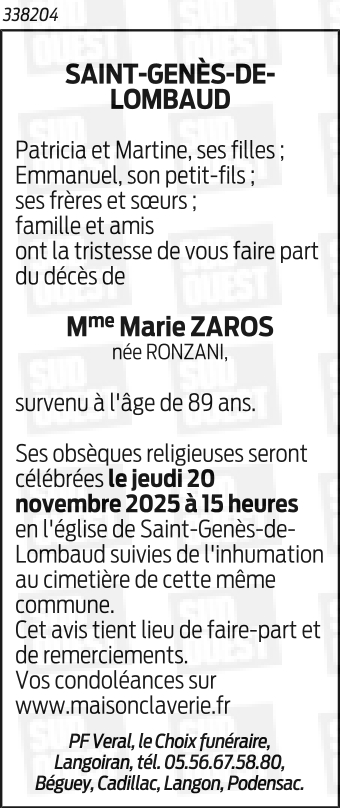 Déroulement des funérailles de Madame Marie ZAROS