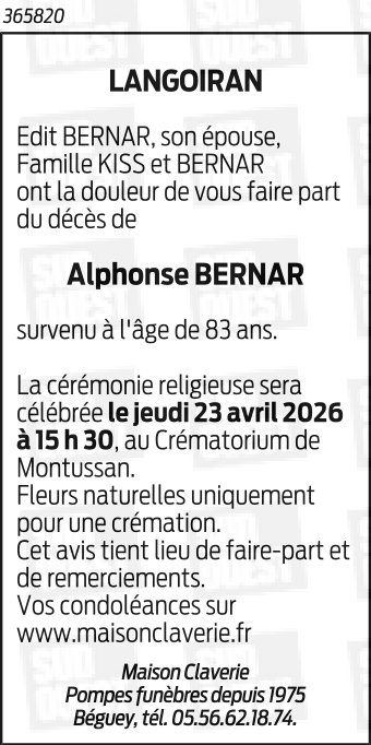 Déroulement des funérailles de Monsieur Alphonse BERNAR