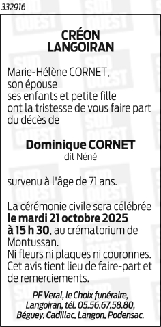 Cette page vous permet de présenter vos condoléances à la famille et de partager l'avis de décès de Dominique.