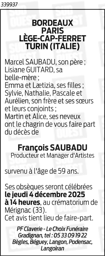 Déroulement des funérailles de Monsieur François Nicolas Laurent SAUBADU