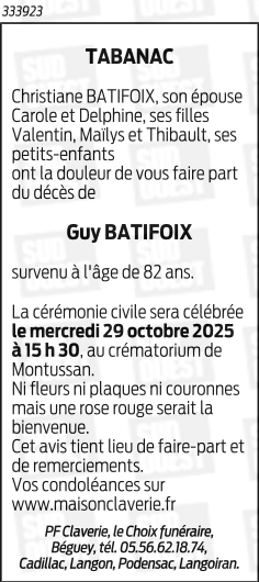 Déroulement des funérailles de Monsieur Guy BATIFOIX