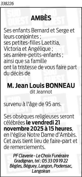 Déroulement des funérailles de Monsieur Jean Louis Pierre BONNEAU